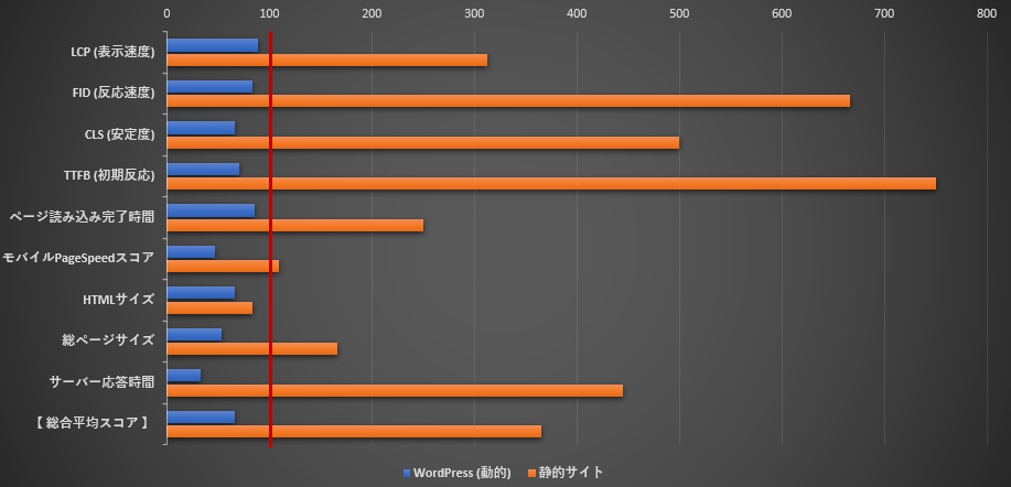 LCPは「ページの主要コンテンツが表示されるまでの時間」を示します。Googleの推奨値は2.5秒以内ですが、WordPressは膨大なプラグインやデータベースクエリの影響で平均2.8秒。一方、静的サイトは0.8秒と、推奨値を大幅に下回る超高速を実現します。